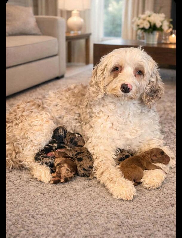 Hallie are family cockapoo has had a beautiful litter of merle puppies . 1 male available. Born on the 7th Jan 2026 .Ready for new home 4th march 2026£1500